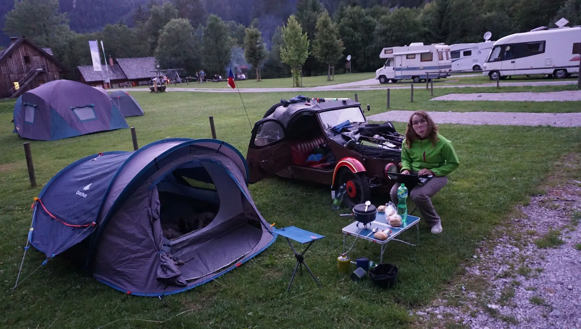Na cestu Brno-Znojmo jsme měli doprovod v podobě Matoušových kamarádů, kteří jeli do Alp na skútrech, a za hranicemi jsme již osiřeli. Česko-rakouské hranice jsme nakonec překračovali 3x, protože jsme se museli vracet na českou stranu k benzínové pumpě koupit samolepku s označením státu. Holt, co není v hlavě, musí být ve Velorexu. A pak už jsme si mohli štrádovat Rakouskem. Ale zas tak rychlé to nebylo, protože já jako navigátor jsem si nemohla zvyknout na styl značení a GPS si postavila hlavu a nechtěla načíst polohu, takže jsme občas bloudili. Ale pak jsme zas nasedli na správný směr a jeli jsme jak o závod směrem k Alpám. I z dálky vypadaly vysoké, když jsme se dostali do horských údolí, byly stokrát vyšší a tisíckrát větší. Ale zase naprosto úchvatné. To ani nejde vyjádřit, jak byly krásné. Sedíme v kempu a jeden z horských štítů je nad námi, myslím, že ráno bude fakt pěkné, až bude vycházet slunce. Matouš si připravil techniku na raně ranní časosběrné video, tak jsem na něj zvědavá, jestli vstane a zapojí ji.
