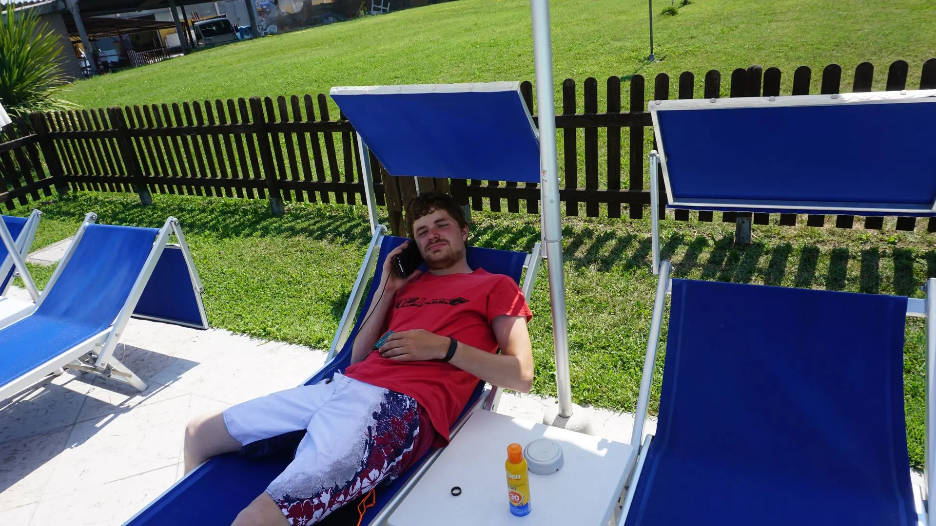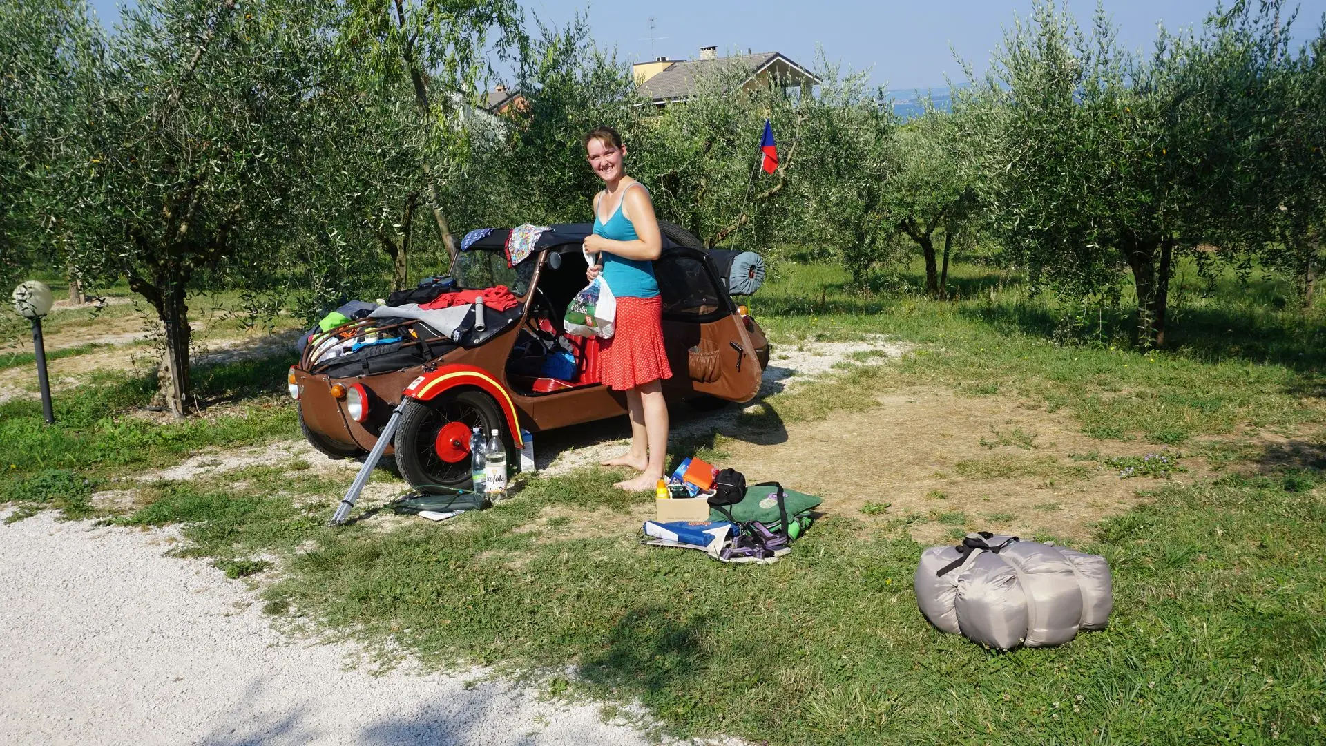 Takže jsme se vrátili k bazénu. Tenhle kemp patří majitelům pocházejícím z Německa, takže asi všichni ubytovaní byli Němci a vedle nás ve stanu Dánové. Ale zjistila jsem, že když musím neměcky mluvit, že mi to zas takový problém nedělá na to, že jsem neměcky mluvila před 4 lety. Ne že bych si tam mohla povídat jak v Čechách, ale věci o autě jsem zvládla překládat. Protože to je nejvíce zajímalo. Vůbec Italové projevovali velký zájem o Velorex, jednak chlapi na benzínkách, ti se vždycky přišli aspoň podívat. A pak lidi ve městě zůstávali stát a jen se za námi nevěřícně otáčeli a řidiči v autech troubili, mávali, fotili a natáčeli nás.