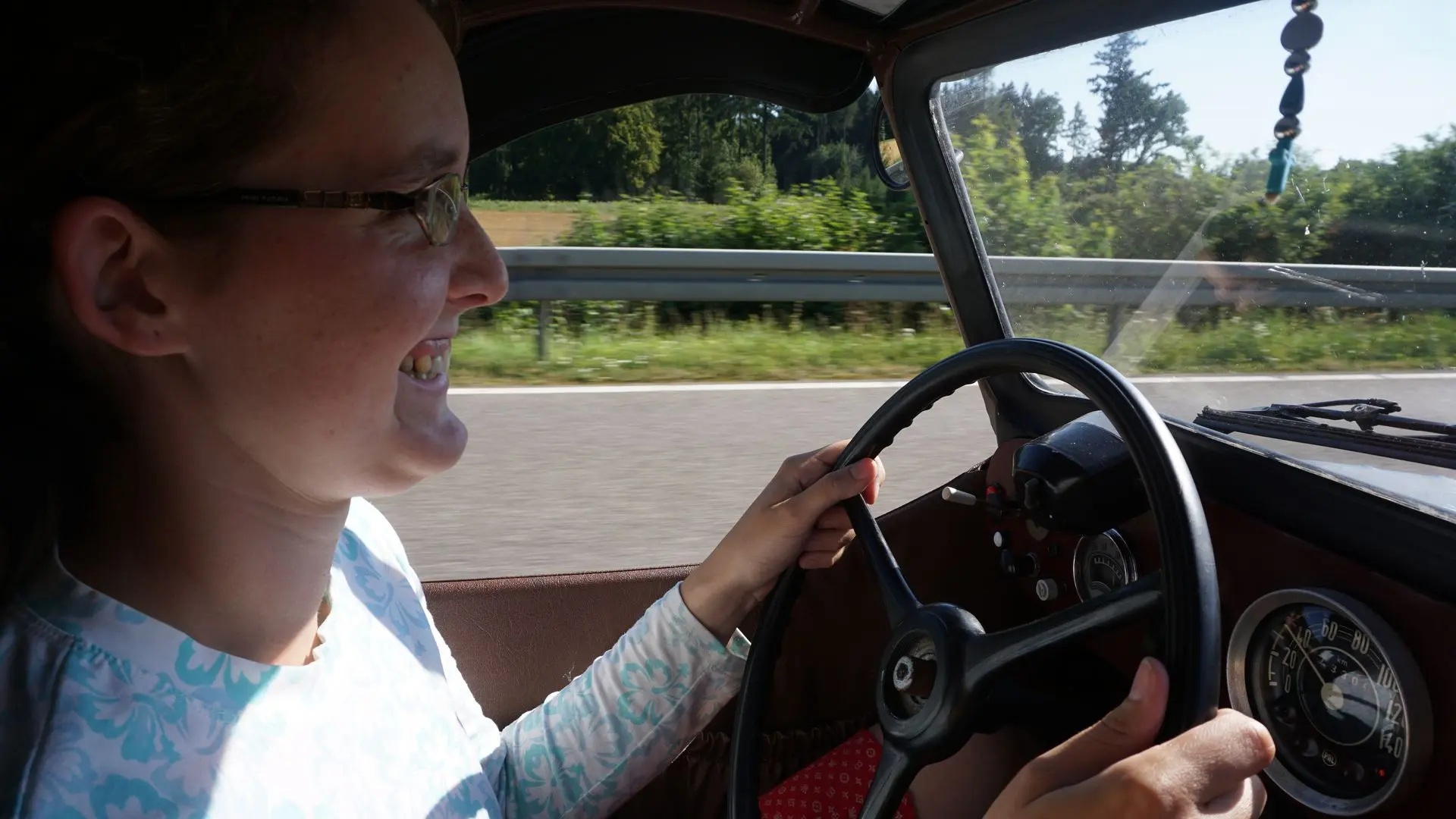 V jednom místě pěstovali chmel, a to byl les chmele, na obou stranách silnice se táhli řady až do dáli. Jeli jsme taky okolo letiště a zrovna startoval vrtulník, dělali jsme si srandu, že je to Medicopter ze seriálu. Spousta kamionů jede stejně rychle jako my, takže nejsme zdržovači provozu a vždycky jsme rádi kamion dojeli, protože pomalá jízda nebyla pak na nás. Ale jednou jsme fakt potkali brzdaře, že jel pomalu i na Velorex. Byl to traktor, který za sebou táhl valník naložený balíkama a jel docela daleko, takže se za ním a námi vytvořila docela dlouhá fronta.